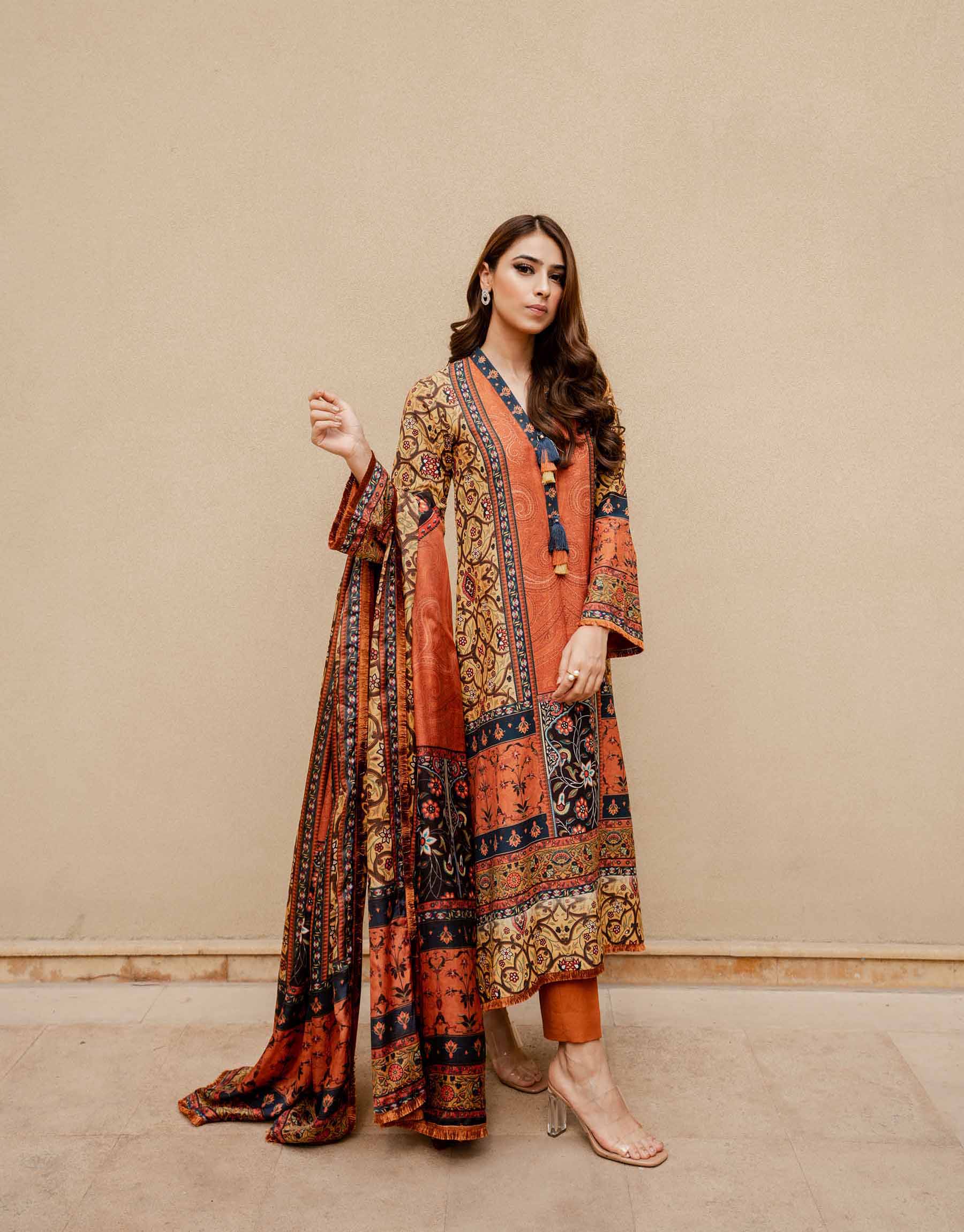 Screen Printed Karandi Silk Shirt with Embroidery details paired with organza Embroidery Duppata and Karandi Silk Shirt