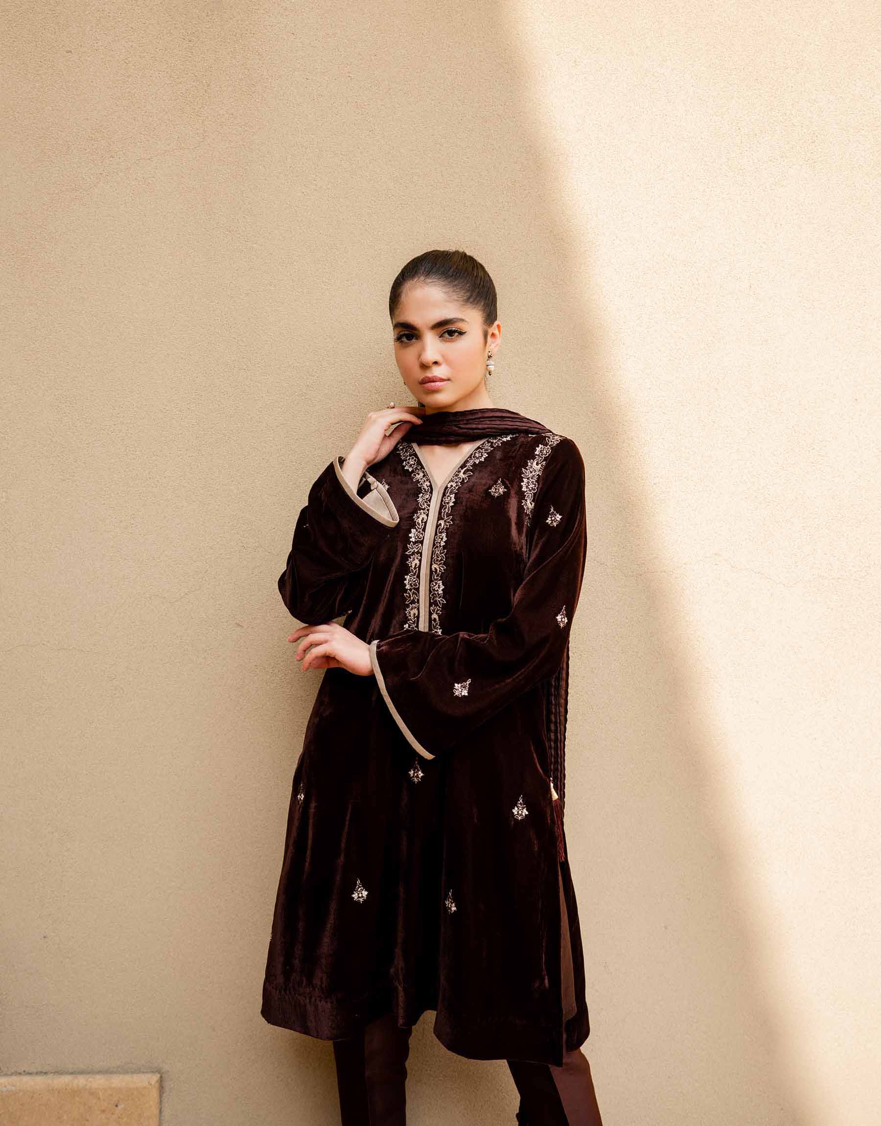 Embroidered Velvet Shirt with mirror details and paired with raw silk pants and velvet applique shawl.